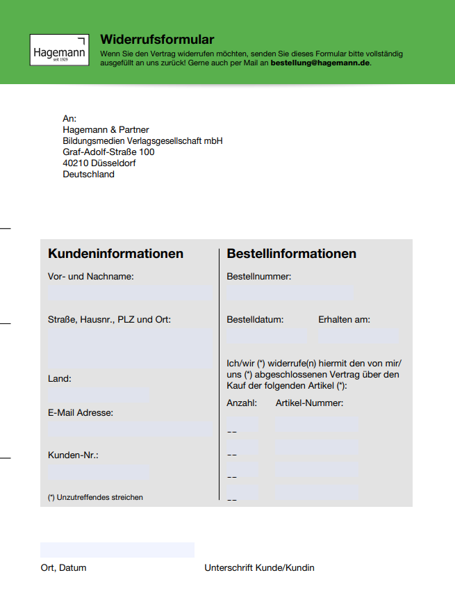 Um Ihr Widerrufsrecht auszuüben, müssen Sie uns (Hagemann & Partner Verlagsgesellschaft mbH, Graf-Adolf-Str. 100, D-40210 Düsseldorf, Tel.: +49 / (0)211 179270-60, E-Mail: bestellung[at]hagemann.de) mittels einer eindeutigen Erklärung (z.B. ein mit der Post versandter Brief oder eine E-Mail) über Ihren Entschluss, diesen Vertrag zu widerrufen, informieren. Sie können dafür das beigefügte Muster Widerrufs-Formular verwenden, das jedoch nicht vorgeschrieben ist.